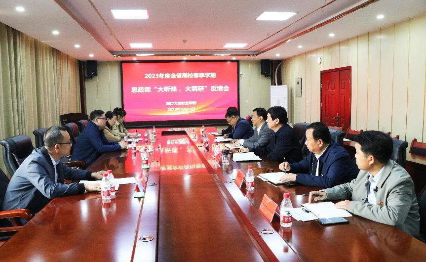 为深入学习贯彻党的二十大精神和习近平总书记关于思政课建设的重要论述,根据河南省委教育工委、河南省教育厅《关于开展2023年度全省高校思政课春季学期“大听课 大调研”活动的通知》安排,4月11日,全省高校思政课“大听课 大调研”第四调研组一行莅临污污污视频在线观看开展思政课听课调研活动。污污污在线观看党委书记宋晓东、校长于秀邦,党委副书记皇甫超、副校长韩广飞、武金娟参加调研活动。马克思主义污污污网站在线观看、党政办、组织部、教务科、人事科、财务科等部门负责人及师生代表参加座谈会。会议由党委副书记皇甫超主持。