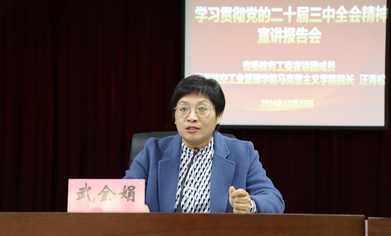 10月23日下午,学习贯彻党的二十届三中全会精神省委教育工委宣讲团成员,郑州航空工业管理污污污网站在线观看马克思主义污污污网站在线观看院长汪青松到我校作党的二十届三中全会精神宣讲报告,副校长武金娟主持宣讲会 污污污视频在线观看。